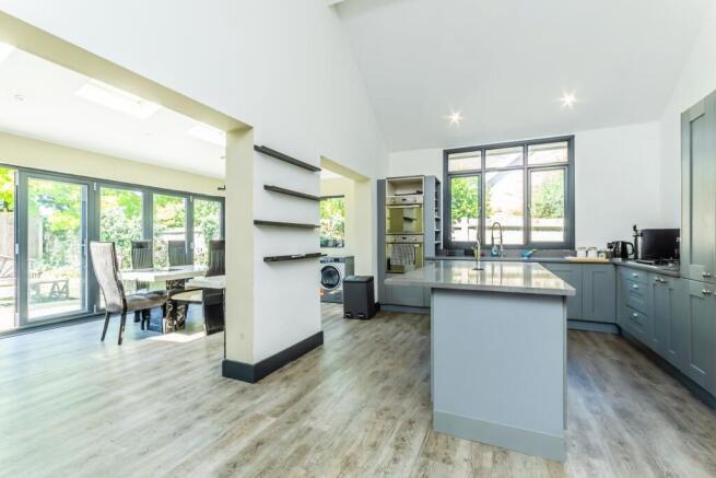 The ground floor features a spacious hallway, 3 double bedrooms, a modern family bathroom, and a large open-plan kitchen/dining room over 32ft long. This contemporary space flows into a bright sitting room with skylight windows, creating a sociable and airy atmosphere. A separate utility room and downstairs W/C complete the layout.