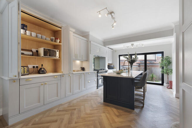 Bifold doors flood the space with natural light, while full-width bi-folding doors extend the room into the rear garden-creating a true indoor-outdoor lifestyle and making this a perfect space for summer entertaining. The flooring is laid with luxurious herringbone-style wood flooring, continuing the refined style seen throughout the ground floor.