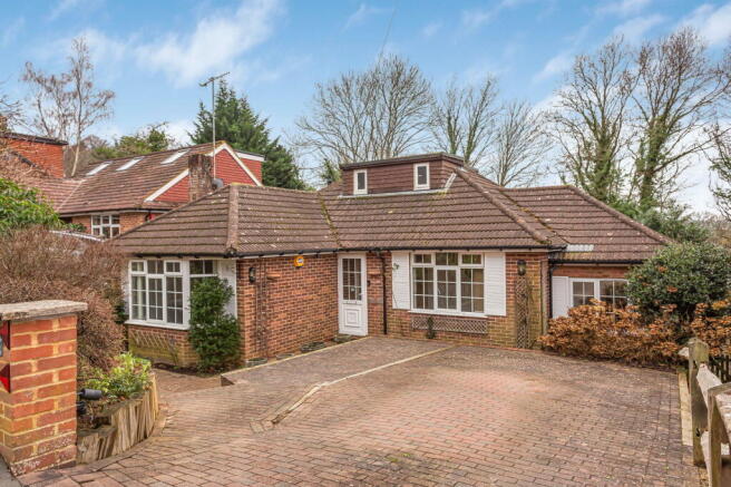 Nestled in a quiet cul-de-sac, the property is approached via a charming brick-paved driveway with parking for two cars. From here, a few steps lead down to the main entrance, surrounded by mature, well-maintained planting.