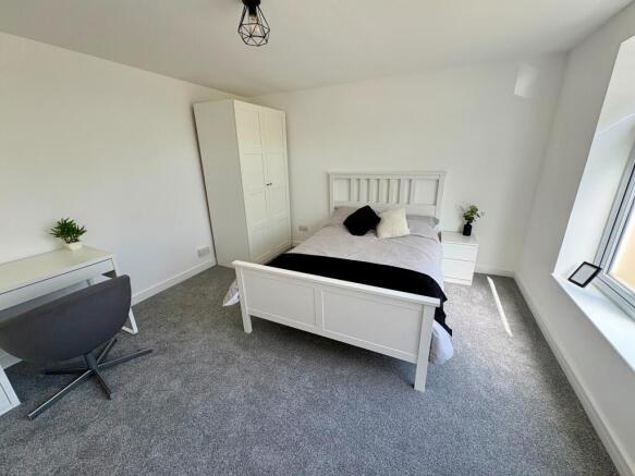 Exclusive double bedroom comprising of double bed, desk and chair, chest of drawers, wardrobe and bedside table. Room is laid to carpet, with windows to front.