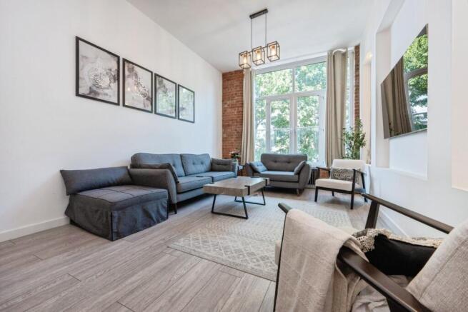 Lounge/Kitchen/Diner - Bright and spacious open plan living space offering generous space for furniture with a high ceiling, tall double glazed windows, wood effect flooring, exposed brickwork, recessed spaces two of which have downlights and both feature hanging ceiling lights and ceiling spotlights. The kitchen is fitted with a range of contemporary shaker-style wall and base units with complementing worktops, a breakfast bar, Metro-style tiled splashbacks, an inset sink basin with a drainer and mixer tap, and an integrated set of appliances including a fridge-freezer, dishwasher, electric oven, countertop ceramic electric hob and overhead extractor hood.