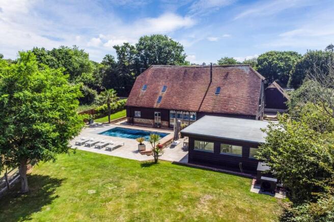 As you approach across the resin drive, the barn’s traditional façade gives way to striking glazed doors that open into an awe-inspiring entrance hall. This double-height space is a statement in itself, with a feature staircase and an abundance of natural light. Adjacent to the entrance is a practical, yet stylish boot room, perfect for coats and shoes, along with a chic cloakroom for guests. The heart of the home is the expansive main reception space, ideal for entertaining or dining, with soaring vaulted ceilings and views stretching out to the garden and shimmering stainless steel swimming pool through expansive bi-fold doors. A impressive, double-sided wood burner adds warmth and atmosphere, linking the main living area with a cosy, intimate sitting room, perfect for relaxing film nights or quiet evenings. A beautifully appointed study, with original beams, offers versatility as a home office or an imaginative playroom. The kitchen is a true chef’s dream: impeccably designed with an array of custom cabinetry, top-of-the-line Miele appliances, a Quooker boiling water tap, and an induction hob. The stylish breakfast bar invites casual dining, framed by lovely views of the landscaped gardens. A spacious utility room, equally well-equipped, provides additional storage and convenient outdoor access.