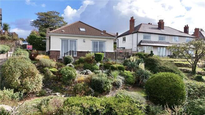 The gardens surround the property on all sides, offering multiple outdoor areas to relax, entertain, and soak up the sun from morning through to evening. At the rear, a private patio awaits, while the front is defined by tiered lawns and mature planting that guides you up to a stylish decked terrace — the perfect spot to take in those sweeping views. On the side, low-maintenance artificial grass and well-kept borders add further appeal. Additionally, a separate garage on nearby Foxhey Road provides valuable storage or parking options.
