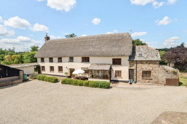 A substantial detached Grade II listed Devon longhouse of stone, cob and rendered construction beneath a thatched roof, believed to date originally from the 1600’s, with later 19th and 20th century alterations. The farmhouse provides spacious five bedroomed accommodation with scope for dual occupancy, whilst exhibiting an abundance of character, including exposed timbers and stonework. The accommodation is entered via a welcoming entrance hall with wide stairs rising to the first floor and an early stair gate. A fully equipped secondary kitchen, created when the farmhouse was formerly occupied in two parts, leads through into a charming sitting room with an inglenook style fireplace inset with a wood burning stove. On the opposite side of the entrance hall is a characterful dining room boasting another large inglenook fireplace with an original bread oven and wood burning stove. The main farmhouse kitchen contains a good range of fitted base units with granite effect composite work surfaces and a matching island unit with a granite top. An Esse oil fired stove provides the beating heart of the house during the winter months, with plumbing and space provided for a dishwasher, and space also for an electric cooker and fridge. An enclosed secondary staircase leads up to the first floor. The kitchen also has an entrance porch leading out to the front. Leading from the kitchen is a utility room with a door out to the rear and a useful downstairs shower room off. A study/snug is also situated off the kitchen with a built-in cloaks cupboard. From here a door leads out to a covered patio area to the side of the house.