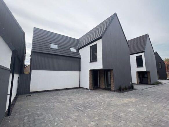 The communal drive is accessible via an electric gate, from there there is 6' timber fencing with gravel borders. the driveway is grey block paved and has sporadic sapling trees.