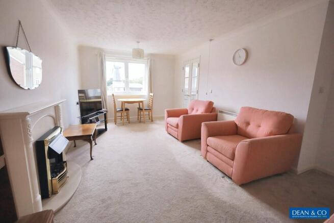 Westerly aspect with double glazed window offering direct views to Blatchington Windmill, two ceiling light points, coved ceiling, night storage heater, feature fireplace, T.V. aerial point, radio point, telephone point, ceiling care call pull cord, double opening glazed casement doors providing access to