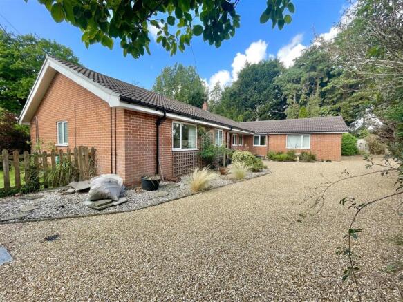 A shingle driveway provides spaces for several vehicles, with double garage found adjacent to the conifer hedging which runs along and screens the front boundary, helping to aid the feeling of privacy. The plot itself is mature, with various planting and landscaping. Triangular in shape, the garden and lawns leads to a point near the junction, where an old, interesting pillbox can be found in amongst various shrubs and trees.