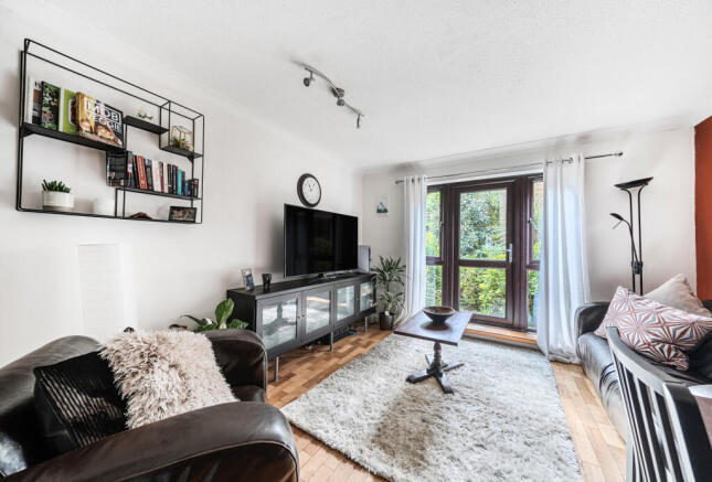 On the ground floor, the entrance leads to a separate kitchen on the left and a bright living room straight ahead complete with wood flooring and opening onto a private patio. The communal gardens are neatly maintained, with tree-lined surroundings and well-manicured lawns, also accessible via a secure gated entrance.
