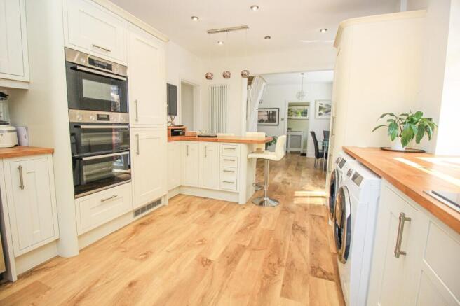The kitchen has a double glazed window to both the rear and side, with a double glazed door to the side opening to access the rear garden, a continuation of the Kardean flooring and a radiator to one wall. There is a range of wall and base units, a breakfast bar with wooden and granite worktops and inset sink. integrated appliances include a BOSH double oven and microwave oven, a BOSH dishwasher and fridge freezer, a NEFF hob with extractor over, with space for a washing machine, a tumble dryer and a wine cooler.