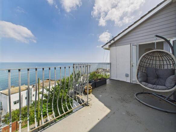 Accessed directly from Dawn Road, the property benefits from private off-road parking for one vehicle. A uPVC double-glazed entrance door with side screen opens into a spacious open-plan sitting and dining room, finished with wood-effect laminate flooring throughout the upper level. A floor-to-ceiling picture window frames the stunning seascape, while French doors open onto a generous balcony with galvanised railings—perfect for soaking in the south-facing coastal outlook.