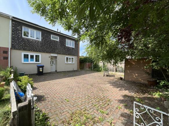 OUTSIDE- To the front is a large block paved patio area with access to the rear garden. The rear garden has a patio area, lawn, green house and timber shed.