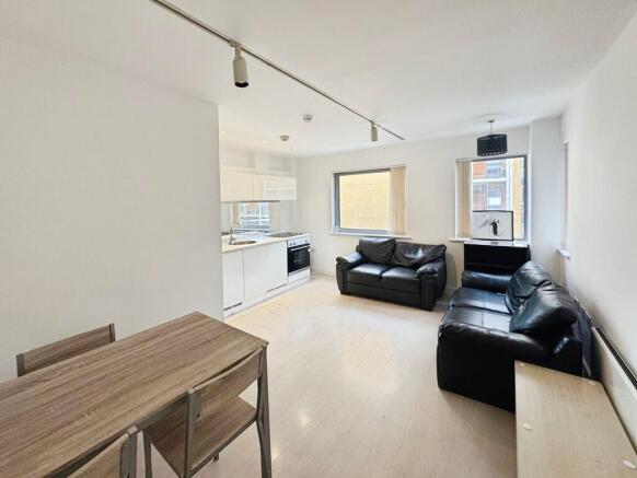 The living space offers views of the inner courtyard. Kitchen is fitted with high gloss white units, integrated oven, hob, fridge and dishwasher.