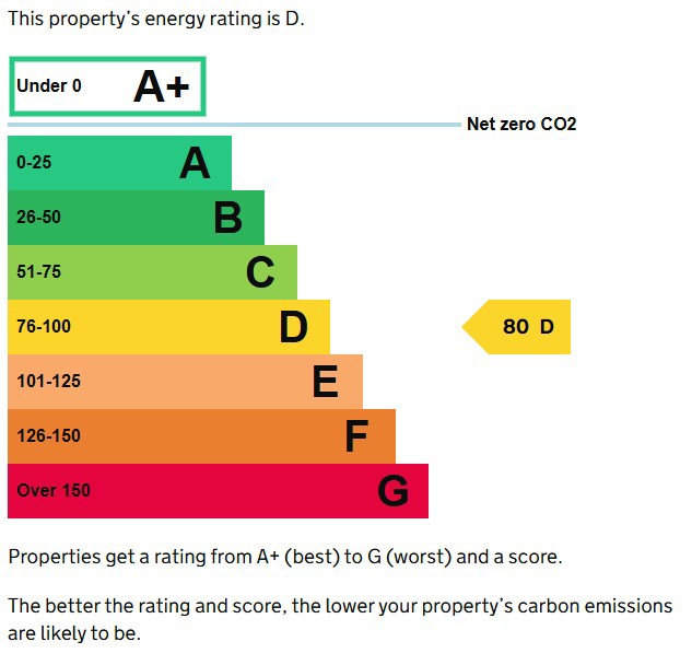 An energy performance certificate (EPC) is available upon request. The property has an energy rating of D (80).