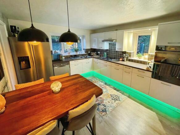 Kitchen with comprehensive range of base and eye level units with ample work surfaces and a breakfast bar. Built-in oven and hob and windows to the rear and side.