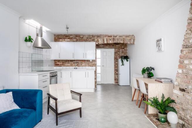The apartment forms part of a handsome period property in the heart of this vibrant neighbourhood. Steps from the street lead down to a private entrance. Once inside, you are welcomed into a spacious open-plan kitchen and living area - the true heart of the home. The kitchen offers a good run of work surfaces, fitted units, and space for dining, while large windows allow natural light to fill the space.
