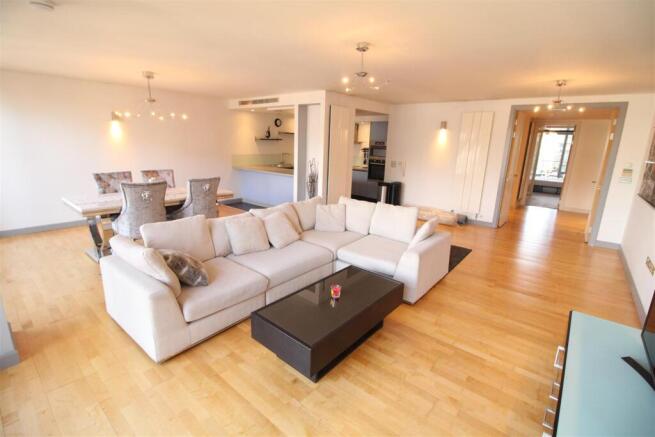 Living Room/Kitchen - 7.46 x 6.67 (24'5" x 21'10") - Impressive living room with floor to ceiling double glazed windows and sliding door leading to decked balcony. Unobstructed views of the canal. Television, telephone and satellite connection point. Vertical radiator. Intercom entry system. Open through to Kitchen. Modern fully fitted kitchen with matching base and eye level units and complementary work tops over. Built in fridge and separate freezer, integrated dishwasher. State of the art microwave/grill, electric oven, ceramic hob and stainless steel extractor hood over. Circular stainless steel sink and separate circular drainer. Ceramic tiles to floor, intercom entry system. Breakfast bar.