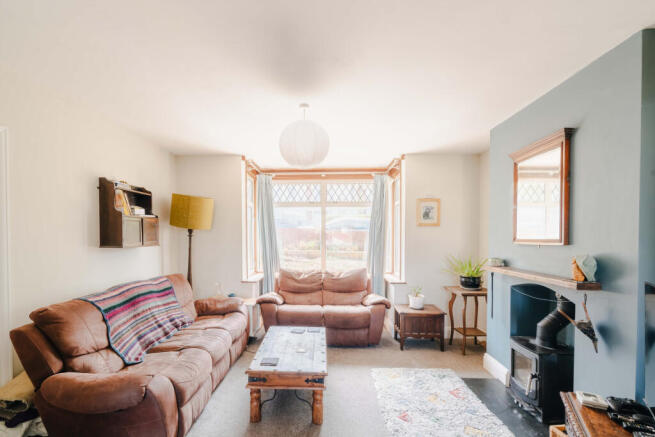 Downstairs, at the front of the property, the spacious living room features a charming log burner and a bay window. This room opens into a second reception area with views over the garden, creating a bright, dual-aspect open-plan living space. A separate kitchen/dining room leads to a utility area, which connects to a shower room and provides access to a raised decking area and the substantial rear garden.
