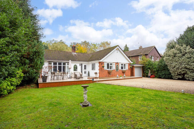 The front of the bungalow is accessed through electric wooden gates that are operated via intercom and the drive has ample capacity for several vehicles. The front garden enjoys a good degree of privacy with the borders stocked with mature shrubs and trees. There is an area laid to lawn and a raised, south-facing patio featuring porcelain tiles which extends the full width of the home gives ample space to relax and dine. The detached single garage has an electronically operated door. The patio in the rear garden also enjoys sunshine and is a lovely space for entertaining. It is similarly enclosed by trees and fences thereby providing further privacy.