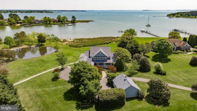 Discover the perfect blend of privacy, luxury, and natural beauty at this exceptional waterfront estate on the protected waterway of "Long Creek" with water views for eight miles across "Eastern Bay". Situated on 3.42 acres with over 800 feet of rip raped shoreline. Designed to capture breathtaking panoramic, water views from nearly every room, the home offers expansive living spaces ideal for both quiet relaxation and grand entertaining. The chef's kitchen is outfitted with high-end appliances, granite countertops, and white cabinetry, flowing seamlessly into an enclosed sun porch and a covered outdoor porch. This home features five-bedrooms, three full baths, two half baths, and a desirable first-floor primary suite; all bedrooms have water views. Enjoy the best of outdoor living with a private 100 foot pier with a 12,000 pound boat lift and a second 2,000 lb. jet ski / boat lift. There is also a sandy beach and tidal pond, all perfect for fishing, boating, kayaking or simply unwinding in nature. Additional features include hardwood and tile flooring, corian surfaces, generous storage, and durable hardiplank siding, as well as a new two year old architectural shingle roof. This property also includes an attached finished three car garage and a detached finished and heated three-car garage for added storage and convenience. Surrounded by beautifully designed gardens and mature trees, this one-of-a-kind waterfront retreat delivers spectacular sunrises, serenity and endless opportunities for recreation and entertainment.