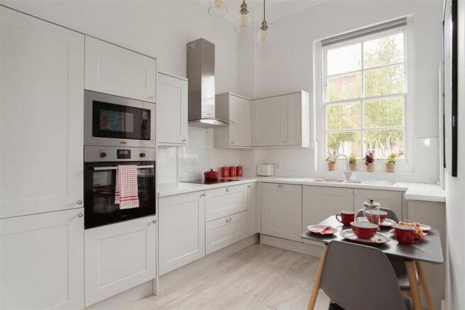 The property combines period charm with modern living, boasting soaring ceilings, elegant cornicing and traditional sash windows that flood the rooms with natural light. The accommodation extends to around 700 square feet and has been tastefully updated throughout, including a contemporary shaker-style kitchen that perfectly blends character with modern convenience. The generous living room is an impressive space ideal for both entertaining and relaxing, while the double bedroom is equally well-proportioned and complemented by a stylish bathroom.