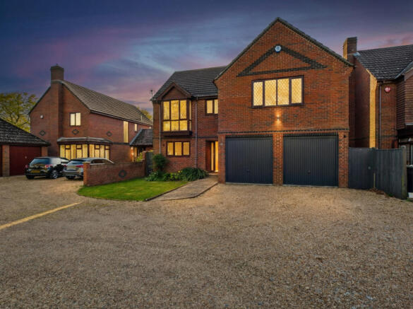 Set on a private plot shared with only two neighbouring homes, the approach is wonderfully secluded, framed by mature trees and lush greenery that create an immediate sense of calm. The attractive brick façade, generous frontage, and ample parking — including an integral double garage — set the tone for the space and quality found throughout.