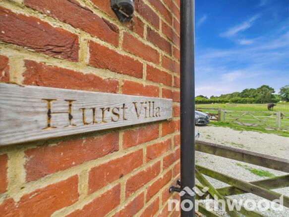 From the moment you arrive, the gravelled driveway sets the tone—winding past mature trees, parked Minis and muddy Land Rovers, toward a home that feels both grounded and grand. The ivy-clad brickwork and hand-carved Hurst Villa sign offer a warm welcome, while glimpses of horses grazing just beyond the fence hint at the lifestyle within.