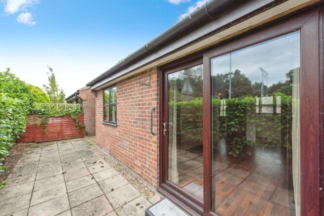 Patio doors to rear, wall lights, electric heater, coved ceiling and wood laminate flooring.