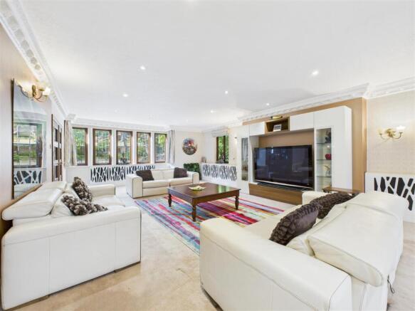 The main sitting room is of exceptional proportions, featuring a media wall elegantly set into the chimney breast, the rear sitting room flooded with natural light from roof skylights opens via French doors onto a decked terrace overlooking the extensive grounds. This area flows seamlessly through into the dining room and a large study with patio doors opening onto the terrace and affords beautiful views of the private garden and woodland beyond.