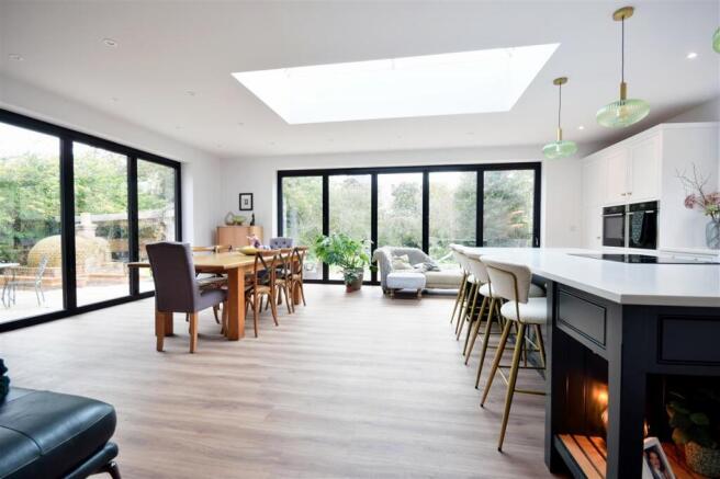An excellent size room ideal for entertaining with KITCHEN AREA with bespoke units and quartz working surfaces comprising double size enamel sink unit with mixer tap, excellent range of storage cupboards, twin eye level ovens, built in corner internally lit larder cupboard, integrated dishwasher, large island unit with built in induction hob with integrated extractor, cupboards under, breakfast bar area to the other side, open to the DINING / FAMILY AREA with huge roof lantern and two sets of double glazed bi-folding doors, one to the side and one to the rear.