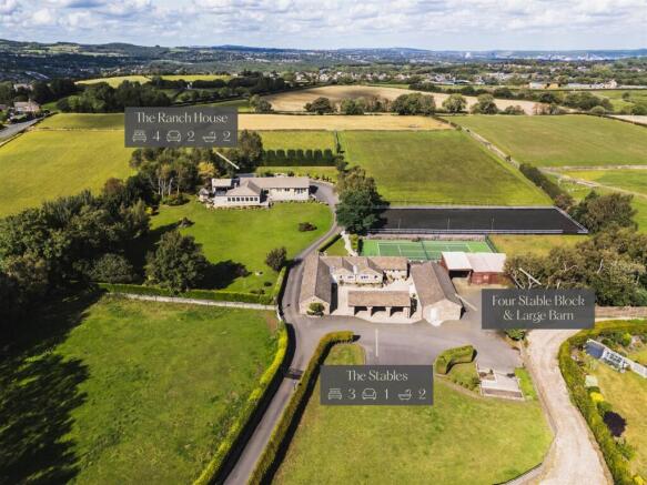 The expansive grounds surround the two homes, with the gardens alone spanning almost two acres. Lush lawns wrap around three sides of The Ranch House, along with a superb tennis court and the extensive driveway that provides parking for several vehicles. For anyone seeking equestrian pursuits, this property boasts excellent facilities such as a stable block with four stables and a tack room, an all-weather, Olympic-sized manège, five enclosed fields and a paddock. Additionally, there is a substantial barn ideal for vehicle storage and an open barn to one side.