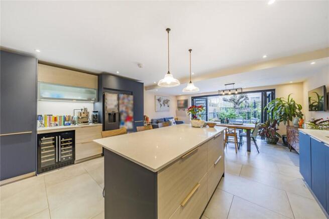 Fitted wall and base units, work tops incorporating sink unit, tiled splash backs, electric hob with extractor above, built in double oven, breakfast island with drawers, space for American style fridge freezer, porcelain tiled flooring, double glazed doors opening to garden.