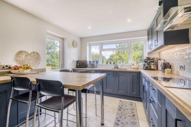 To the front, the property offers off-road parking for two vehicles alongside a lawned front garden and hedge providing privacy. Stepping inside, the entrance hall provides a welcoming sense of space with a useful cupboard for coats and boots. The dual-aspect sitting room is light-filled with plenty of seating space and a feature electric fireplace. This room flows seamlessly into the dining room. With French doors opening directly onto the patio the dining room is a bright and versatile space ideal for entertaining or family life. Beyond lies a utility area, downstairs cloakroom, and a recently fitted contemporary kitchen (installed July 2024) with a breakfast bar and garden outlook.
