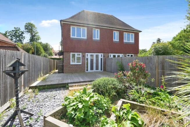 Externally, the property boasts a low-maintenance rear garden, featuring a raised decked area adjacent to the house, a shingled section, and a raised flower bed adding colour and interest. Side access leads back to the front of the property, where the large driveway offers parking for several vehicles.