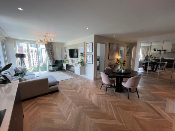 Offering a very spacious and flexible open-plan layout, with ample scope for living and dining areas. The apartment's corner position allows for full-height windows to dual aspects, providing excellent natural light and great views across the city centre skyline. Upgraded herringbone-style flooring creates a stylish contemporary ambience, together with a feature media wall with backlit panel and cupboards mounted below. The kitchen area offers a range of base and wall units with contrasting worktops, inset sink with mixer tap and worktop lighting. Integral appliances include and electric oven, electric hob with extractor hood, microwave, fridge/freezer and dishwasher. Cupboard with plumbing for washing machine and further store cupboard, with mirrored doors to enhance the spacious feel.