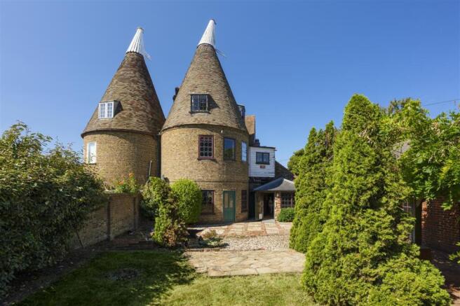 The property boasts a distinctive and memorable façade, dominated by a traditional circular oast tower topped with iconic white cowls an unmistakable nod to Kents rich agricultural heritage. Constructed from warm-toned brick and crowned with conical, clay-tiled roofs, the oasts create a striking and instantly recognisable silhouette. The front elevation is a harmonious blend of period materials, including exposed brickwork, painted timber cladding, and a classic Kentish tiled roof, while leaded lattice windows and a wide, solid timber front door further enhance the homes historic appeal.