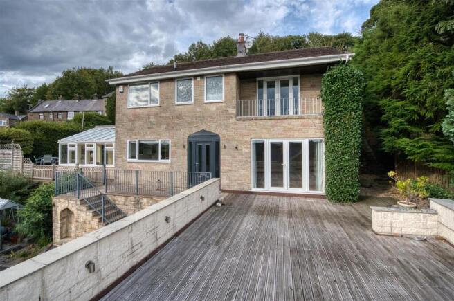 Rear Garden - To the left of the home is a dining patio, with steps up to the long rectangular lawn behind the home. The raised decked area in the top left provide views over rooftops to the valley beyond. At the far end of the lawn, a path leads to a secluded vegetable garden with greenhouse, vegetable patches and even more wonderful views!