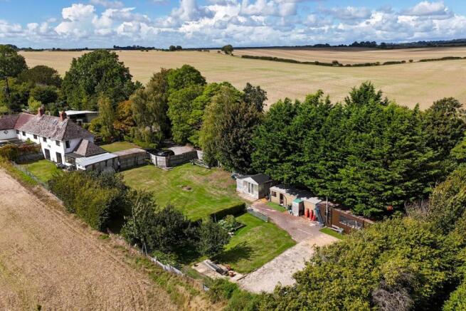 Outside, the grounds extend to approximately 0.4 acres, clearly defined with the aerial view, with well-kept lawns, mature planting, and a selection of useful outbuildings. A gravel driveway leads up through the garden, framed by trees and hedgerows, and opens to uninterrupted countryside views.