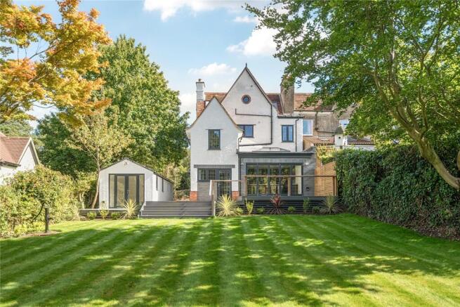 Meldon Cottage on Tilford Road, originally built in 1907, has been thoughtfully extended and renovated to the highest modern standards while retaining its historic character and quirks. This semi-detached family home offers generous proportions and an abundance of natural light throughout, with high ceilings and a seamless flow of space. The centrepiece is the ultra-modern open-plan kitchen, featuring a striking ribbed walnut island with white quartz work tops, opening onto a dining and reception area illuminated by a singular skylight. The master suite occupies the distinctive 55-degree pitched loft and boasts a luxurious en suite with both bath and shower, where the bath sits beneath twin Velux windows and enjoys views through the original porthole window. All bedrooms are doubles bar one, and the family bathroom has been finished to the same exceptional standard as the rest of the home. Outside, a large level garden includes a versatile studio and garage, with driveway parking for up to three cars, making Meldon Cottage a rare blend of period charm and contemporary family living.