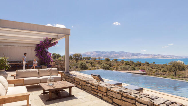 Spanning approximately 330 sq.m., the residence offers unobstructed panoramic views of the Aegean Sea, the island of Paros, and a protected ravine to the north. The layout includes four spacious en-suite bedrooms, thoughtfully positioned to provide privacy and comfort. The main living areas are designed to offer seamless transitions between indoor and outdoor living, with expansive terraces, shaded dining areas, and a large pool area perfect for lounging.