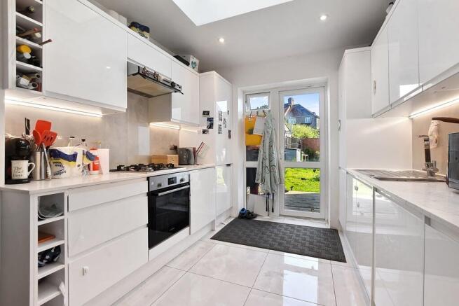 Stainless steel sink unit. Built-in matching wall and base cupboards with work surfaces above and tiled surrounds. Tiled flooring. Double aspect double glazed windows. Skylight. Gas hob with oven below and extractor hood. Cupboard with gas boiler. Double glazed door to rear garden. Plumbing for washing machine. Integrated appliances.