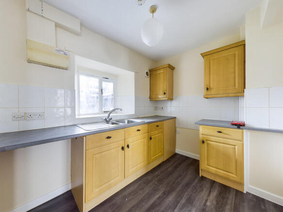 Located to the right of the hallway, the fitted kitchen is accessed via a short walkway. The kitchen features wooden cupboards and work surfaces, alongside allocated spaces for appliances. Its layout is practical and functional, providing everything needed for day-to-day cooking.