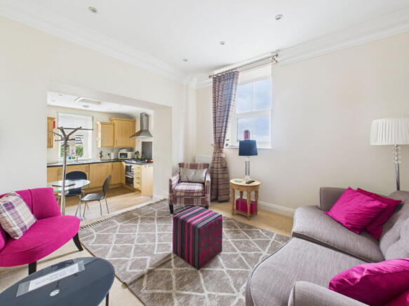 The living room is a bright and welcoming space, finished with neutral décor that enhances the sense of light and openness. A sash window draws in natural daylight and, together with the high ceilings, adds to the room’s airy and characterful feel. Its generous proportions provide flexibility for a variety of layouts, making it equally well-suited for relaxation or entertaining. An open-plan arrangement flows directly into the adjoining kitchen, creating a sociable setting that works perfectly for modern living. The design allows for a seamless connection between the two spaces, while still maintaining a defined lounge area that feels comfortable and inviting. From here, a door leads through to an inner hallway.