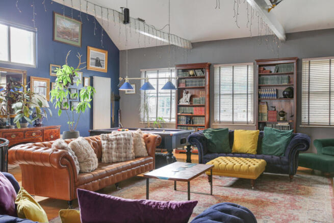 This truly exciting mezzanine room accessed by a second cast iron staircase is perched at the top of the home with a panoramic view across the huge living space offering endless possibilities - a third double bedroom, a creative studio, a stylish work from home space or simply just another incredible living space. A triangular window offering light while bespoke storage and exposed beams and wooden flooring add character and practicality.