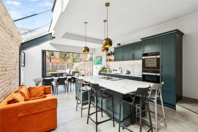 The double reception room with high ceilings, intricate cornicing, a feature fireplace and bay window is located to the front of the ground floor. The rear of the double reception opens onto the impressive kitchen family room, also accessed from the hallway. This room is wonderfully bright thanks to skylights that run the length of the property. The kitchen itself benefits from shaker style wall and base units, quartz work surfaces, double larder and the pull-out larder as well as a large island/breakfast bar. The room benefits from high ceilings and has plenty of room beyond for either comfortable seating or a dining table. Bi-fold doors open onto the walled patio garden, ideal for al fresco eating and entertaining in the warmer months. A WC can also be found on this level.