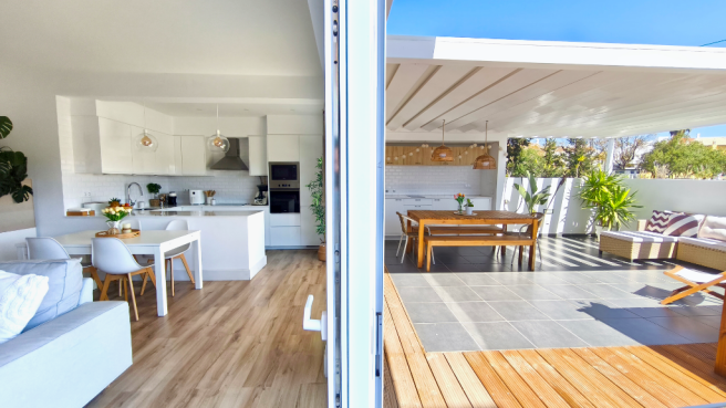 Spacious terrace with private pool and outdoor kitchen, accessible directly from the living room - perfect for relaxing and entertaining