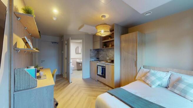 Designed with practicality and comfort in mind, the studio features a private ensuite bathroom and a fully equipped kitchen, creating a complete living space ideal for focused study and relaxation. With high-quality finishes and contemporary design throughout, this flat offers a stylish and hassle-free student lifestyle in a vibrant and central location.
