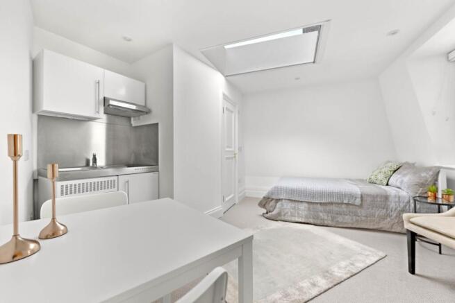 Measuring approximately 225 sq ft, the property offers a well designed layout with space for dining and sleeping zone, a sleek kitchenette and a contemporary shower room. Being positioned at the rear of the building provides a wonderful sense of peace and security, while its first floor setting enhances the appeal. The flat is offered with vacant possession and will benefit from a new 125-year lease upon completion.