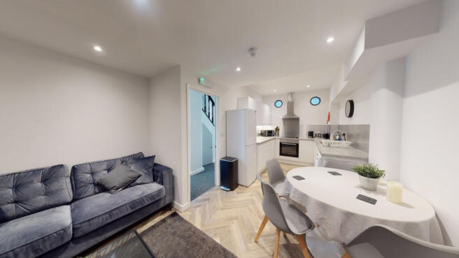 Cosy Open-Plan Living Area – Bright and welcoming communal space with comfortable seating and a dining area – perfect for relaxing or socialising with housemates.