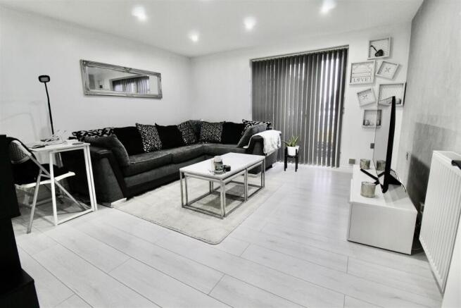 Lounge - 4.14m x 3.94m (13'7" x 12'11") - Double glazed window to the side of, and at matching height to the double glazed French doors to the front leading to the balcony area. Two radiators, spotlights inset to the ceiling and a modern style grey wood effect flooring.