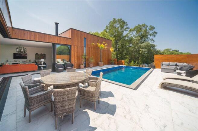 The main living spaces are arranged in an elegant L shape, comprising a spacious open plan sitting and dining area, and a high specification, bespoke kitchen, all of which open seamlessly onto a large paved terrace. There is the addition of a utility room and separate W/C.